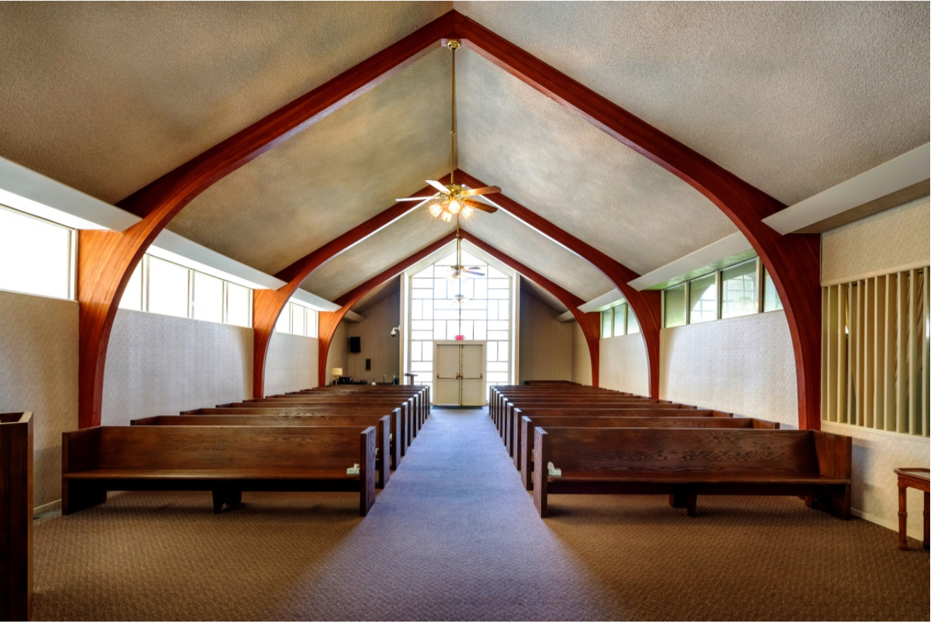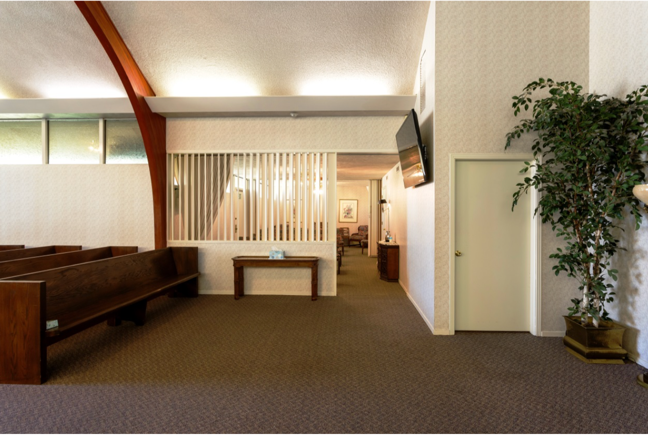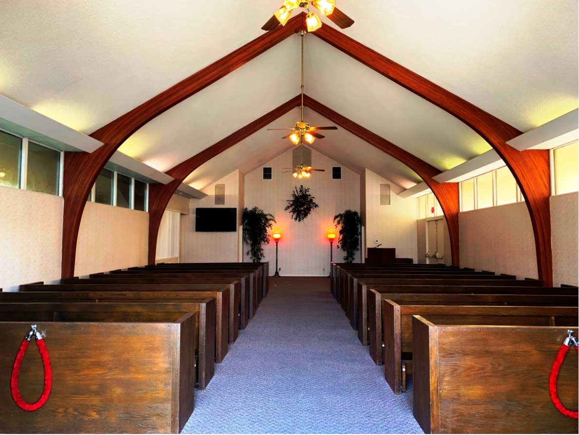Can be used for viewings, wakes, rosaries, and services. It features vaulted ceilings, spacious pews and available separate family area.