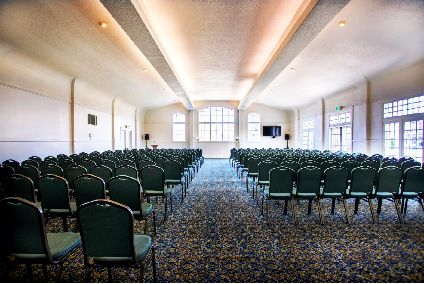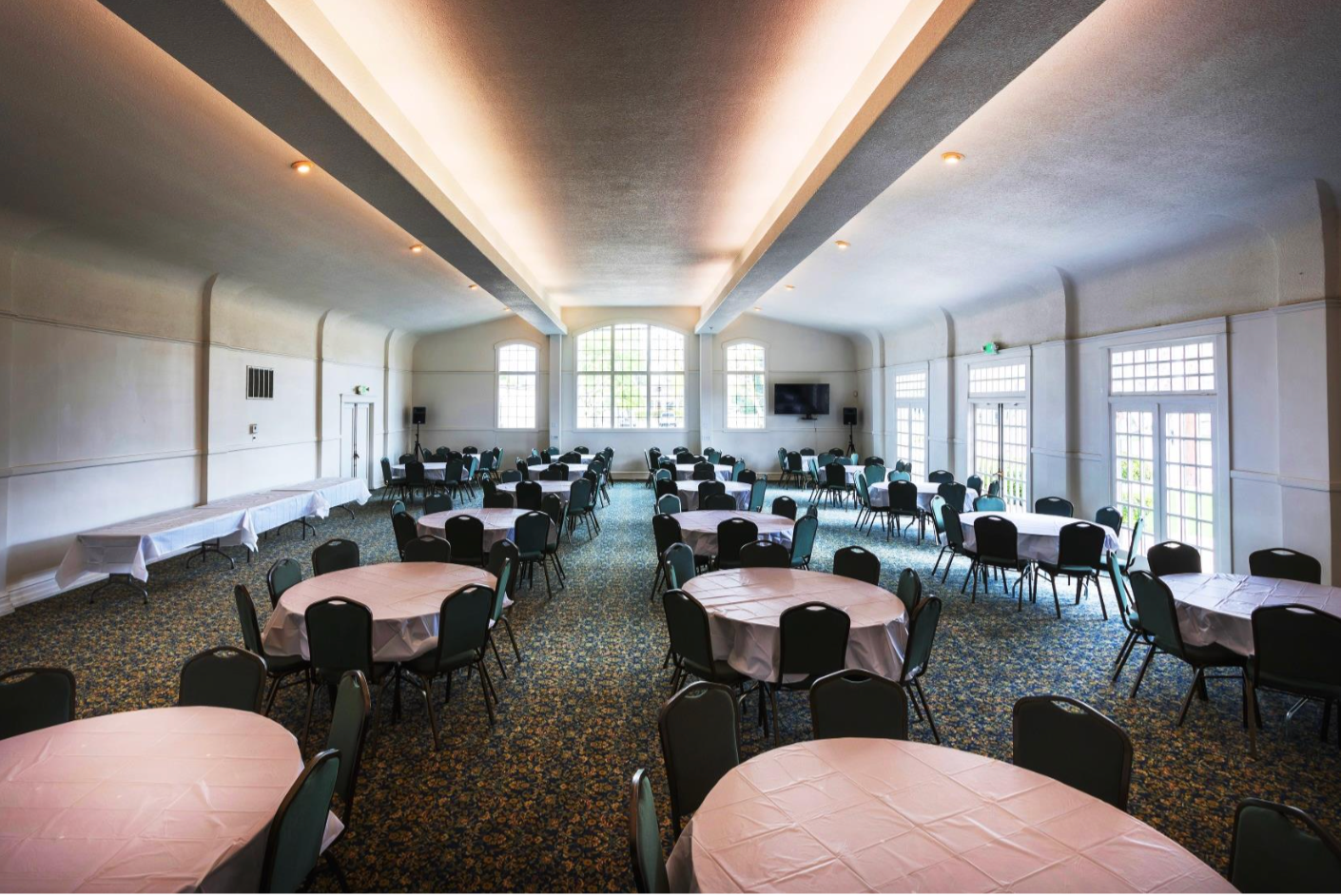 Can be used for viewings, wakes, rosaries, services (see bottom left picture set-up) or luncheons (see bottom right picture set-up). It features a bright and airy open space with a multitude of large windows. We provide up to 19 round tables (each seating 8), white plastic tablecloths, 3 side tables to use for food and drink. Call us for further information.